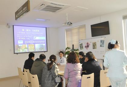 “2楼3楼是分开区域,2楼设定为普通病区;3楼为24小时监控的肿瘤癌痛病区,4楼为含2个研究所和国内外交流中心在内的行政管理综合区……”李玲博士不仅陪同大家参观了整个中心,还通过ppt课件向大家作了介绍。